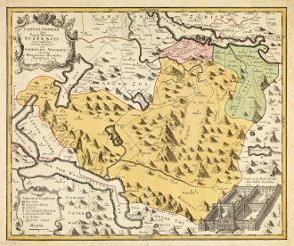 Sie geben Informationen über die geschichtliche Entwicklung von Schwyz. Auf dieser Karte von 1767 ist zu sehen, dass Schwyz damals noch aus nur drei Bezirken bestand – Höfe, March und Schwyz. Die Bezirke Einsiedeln (seit 1798) und Küssnacht (seit 1833) fehlen. Die überdimensionierte Darstellung des Klosters Einsiedeln lässt ausserdem auf dessen grosse Bedeutung schliessen.