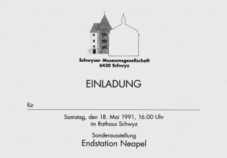 Die letzte Phase der fremden Dienste von Schwyzern in Neapel bedeutete einen grossen Umbruch: Altes verschwand unwiderruflich und es wurde nötig, sich mit einem neuen Staat zu identifizieren. Diese Ausstellung stand in Zusammenhang mit den Feierlichkeiten rund um das 700jährige Jubiläum der Eidgenossenschaft.