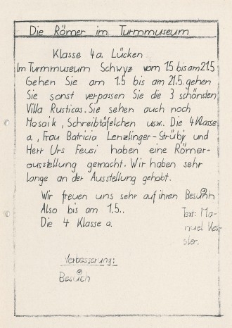 Im Rahmen der Römerausstellung engagierte sich auch die Klasse 4a des Schulhauses Lücken. Vom 1.5.1993 bis am 21.5.1993 stellten die Schüler selbst hergestellte «römische» Objekte aus und machten fleissig Werbung für ihre Ausstellung.